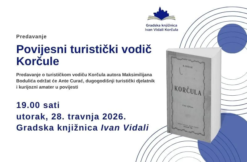 Pozivamo vas na predavanje o povijesnom turističkom vodiču Korčule koje će održati Ante Curać u Gradskoj knjižnici Ivan Vidali u utorak, 28. travnja, s početkom u 19.00 sati. U godinama neposredno nakon Prvog svjetskog rata u Korčuli nije bilo turizma (1919.-1921. otok Korčula je bio pod Talijanskom okupacijom), no izgleda da je u godini 1922. ipak bilo […] |