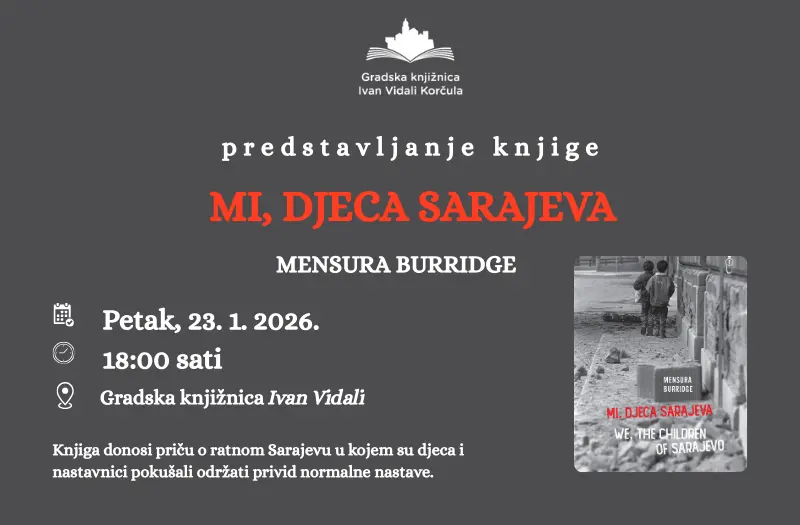 Pozivamo vas na predstavljanje knjige Mi, djeca Sarajeva autorice Mensure Burridge koje će se držati u Gradskoj knjižnici Ivan Vidali u petak, 23. siječnja, s početkom u 18.00 sati.