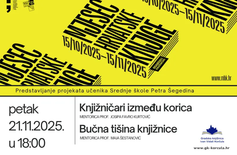 Pozivamo vas na predstavljanje projekata učenika Srednje škole Petra Šegedina koje će se održati u petak, 21. studenoga u Gradskoj knjižnici Ivan Vidali s početkom u 18:00 sati. Profesorica Maja Šestanović će s učenicima predstaviti projekt Bučna tišina knjižnice, a profesorica Josipa Favro Kurtović će s učenicima predstaviti projekt Knjižnica između korica.